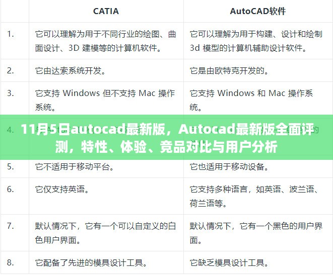 随着计算机辅助设计领域的不断进步,Autocad最新版于11月5日的推出引起了广大设计师和工程师的极大关注,作为一款功能强大、操作便捷的设计软件,新版本在继承了原有优秀特性的基础上,还加入了许多创新元素,本文将从产品特性、使用体验、与竞品对比、优缺点分析以及目标用户群体等方面,对Autocad最新版进行全面介绍。
