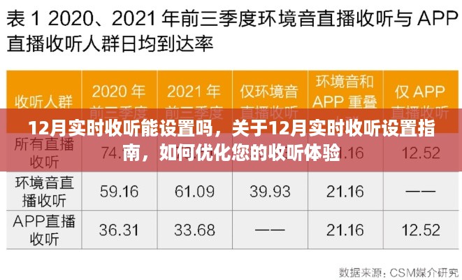 随着科技的不断发展,人们对音频娱乐和信息的实时需求日益增长,在数字化时代,我们如何确保在12月乃至全年任何时刻都能获得最佳的收听体验呢?本文将围绕实时收听设置的重要性,特别是针对12月的特殊情境,为您提供一些实用的建议和指导,我们将重点讨论要点一:设备设置与功能选择;要点二:网络环境的优化;以及要点三:个性化收听体验的设置。