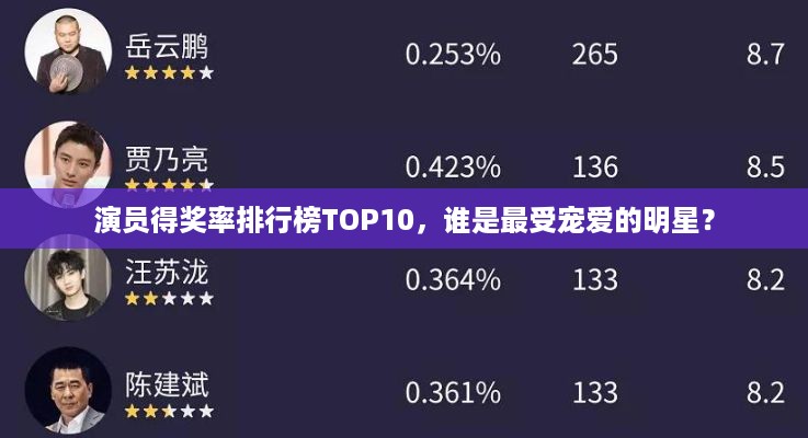 在娱乐圈中,演员的竞争日益激烈,得奖率的高低往往能反映出演员的实力和影响力,以下是当前演员得奖率排名前十名,这些演员以其出色的演技和作品赢得了众多奖项和观众的认可。